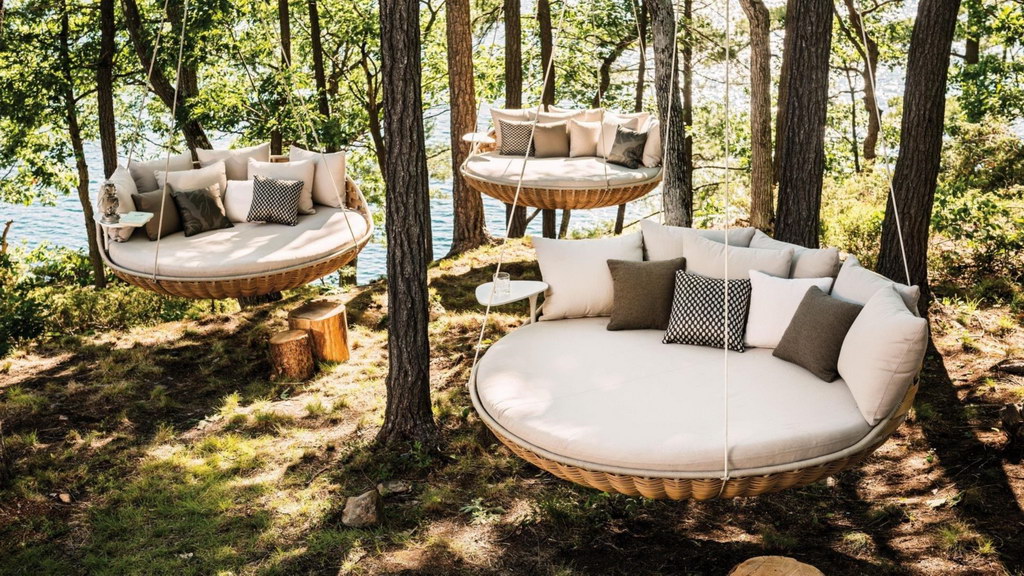 Einen Teil des Namens sowie den Großteil der Konstruktion teilt sich das Outdoor Sofa mit DEDONs NESTREST. Dennoch ist das Design von Daniel Pouzet eine Klasse für sich und bietet einige Vorteile: schwenkbare Tischplatte, elegante Aufhängung – perfekt zum Aufhängen auf der Terrasse oder Veranda. Sogar im Inneren des Hauses zu empfehlen.